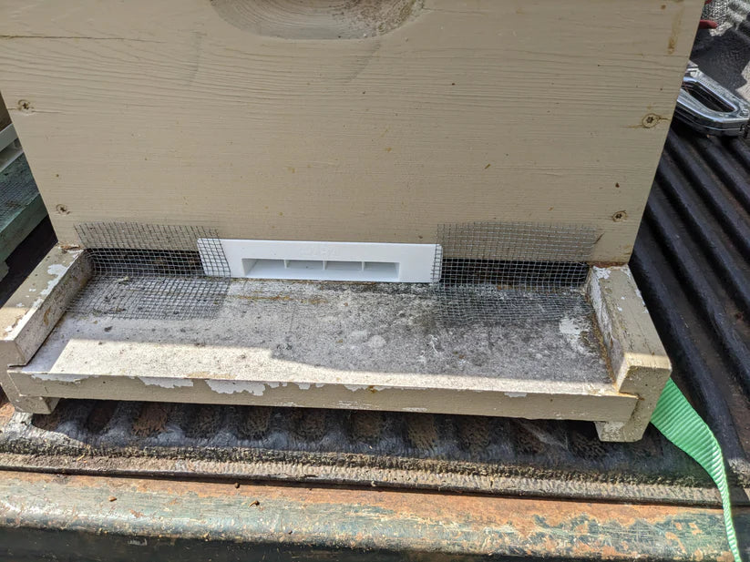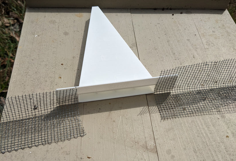 Directions: Use the 3/4 inch opening side of your 5, 8 or 10 frame hive. Insert a hive tool in the side of the entrance and lift slightly to insert the Day Tripper in the center. Make sure the flange is snug up against the face of the hive body. Secure a piece of your screen on either side to completely cover the entrance, overlapping the Day Tripper slightly. I use #8 hardware cloth and a staple gun. With short pieces of screen, one staple may be enough. Sit back and watch the girls fly home! While you’re waiting, secure the hive for transport. I use ratchet straps. If you need more ventilation, consider switching to screened bottom boards or a screened inner cover for the journey.